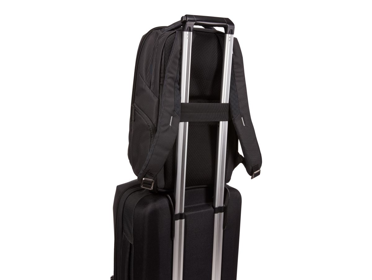 Batoh je možné zavěsit na zavazadlo na kolečkách pomocí integrovaného pásu s otvorem.